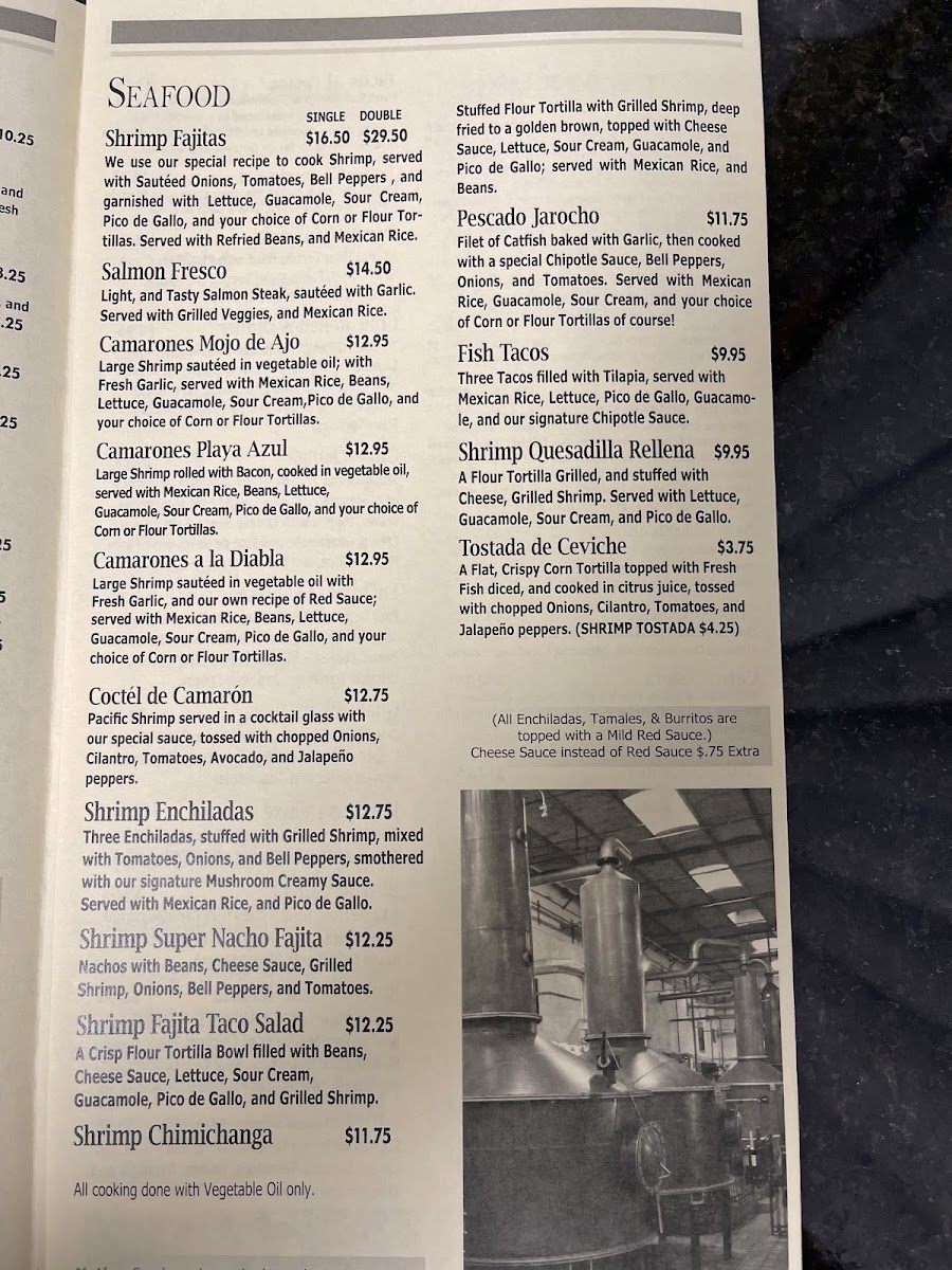 Filet of catfish baked with garlic, then cooked with a special chipotle sauce, bell peppers, onions, and tomatoes. Served with Mexican rice, guacamole, sour cream, and your choice of corn or flour tortillas.