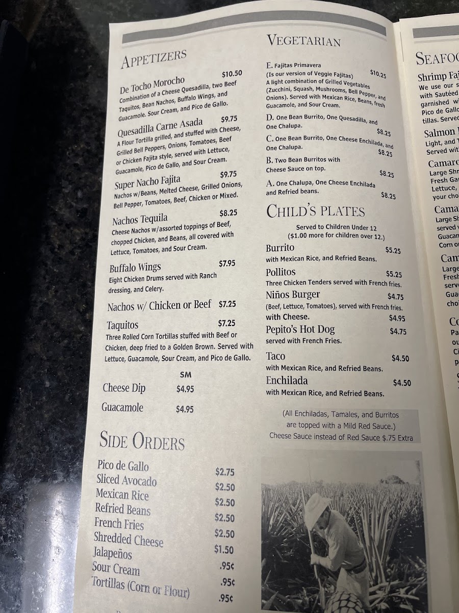 Marinated tender strips of chicken and shrimp with sautéed onions, bell peppers, and tomatoes on a bed of rice with cheese dip on top, and your choice of corn or flour tortillas.